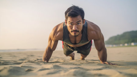 Generative AI : male athlete trains pushed on the nature on the beach