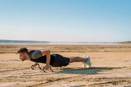 Portrait of an athletic man doing push-ups at the beach. Sport and healthy lifestyle concept.