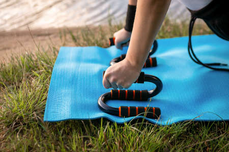 personal trainer working out, doing push ups. Sports concept and details