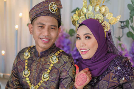 Indoor shooting for Malay wedding, the bride and groom wearing Malay traditional cloth in solemnization of marriage ceremony . Happy & Family Concept