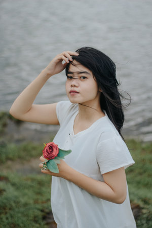 Portrait of a pretty young woman dressed in white dress holding rose flowers