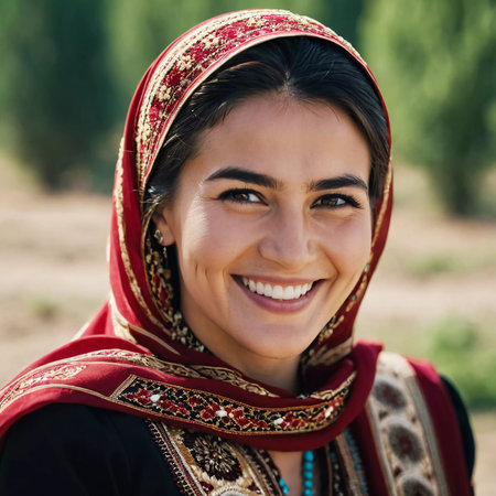 A woman from Afghanistan beams with joy, showcasing her warm smile. Dressed in traditional attire, she represents the vibrant culture of her community, radiating positivity. Generative AI.