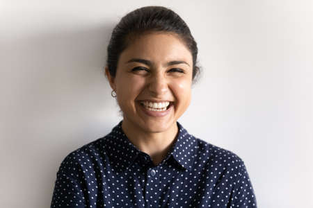 Close up portrait of smiling millennial Indian female isolated on grey studio background laugh at funny joke. Overjoyed happy young mixed race ethnicity woman have fun feel excited. Humor concept.