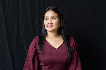 A joyful woman 45 years old from Afghanistan displays a bright smile while wearing traditional clothing. She stands confidently, embodying a sense of peace in her rural community. Generative AI.