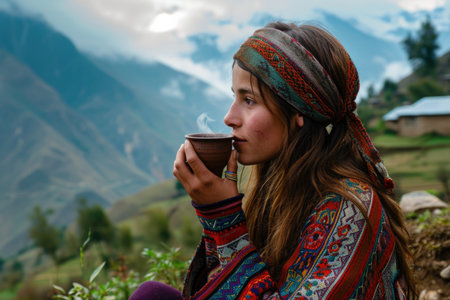 Experiencing a cultural ritual, a woman thoughtfully drinks tea outdoors with a scenic mountain range in the distance.