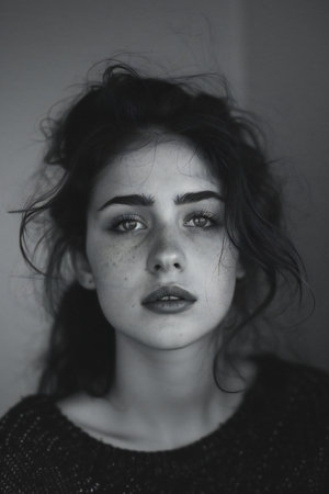 This portrait captures a young woman in a minimalist environment, radiating beauty and elegance while showcasing her soft expression and natural light.