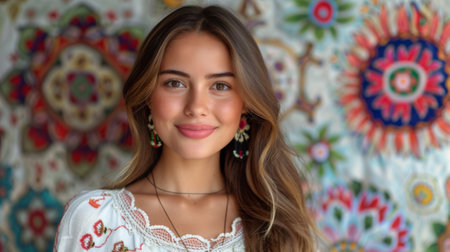 Portrait of beautiful Colombian woman in national costume. Traditional colorful clothes, makeup and jewelry. Generative AI