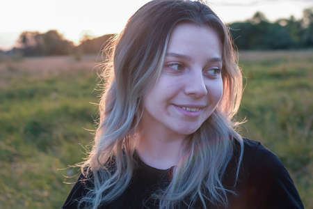 portrait of a beautiful European girl with loose hair against the background of nature. selective focus