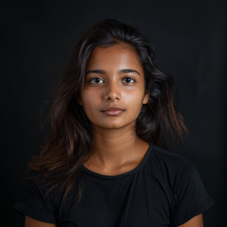 A young woman stands confidently with her long dark hair cascading over her shoulders. She wears a black hoodie, looking directly at the viewer with a thoughtful expression.