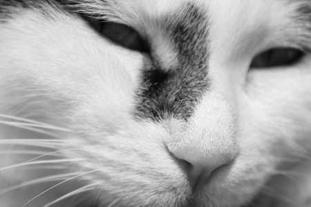 Close photo of cat face. Black and white portrait, very soft focus
