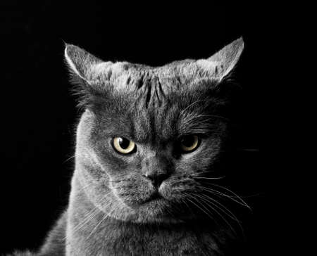 Portrait of British cat push gay. Curious looking in camera. Front view. Black white.