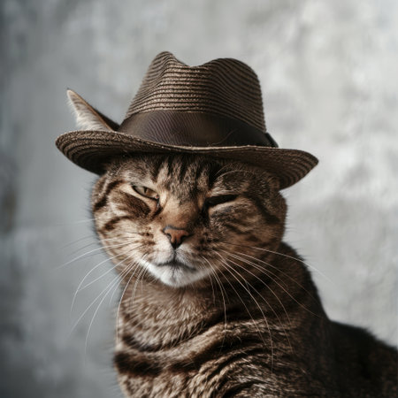 Adorable cat showcases a quirky style wearing a hat with a confident expression. This playful indoor portrait captures the charm and personality of a beloved pet.
