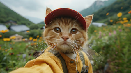Generative AI, cute cat traveler is taking selfie photo, summer mountains on background