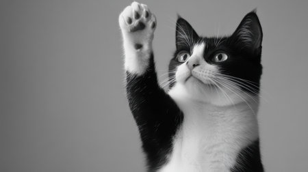 A captivating black and white cat raises its paw in a playful gesture, showcasing curiosity and charm. This delightful portrait captures the essence of a loving pet.