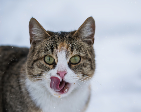 Cat licking in the snow on a winter day outdoors