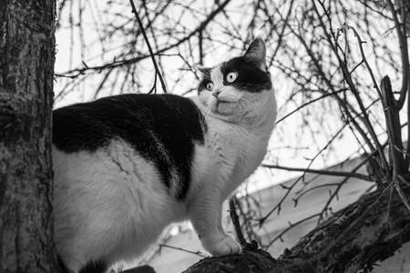 A Beautiful adult young black and white cat with big eyes sits on a apple tree without foliage in the garden in autumn