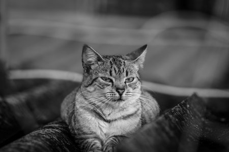 Gorgeous tabby cat lying in a couch, staring straight at the camera. Black and white image.