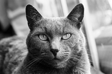 Black and White portrait of a Russian Blue tabby cat looking at the camera