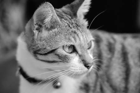 Photo of domestic cat (pet) in closed plan, with a fixed and cute look. Real animal in a real situation.