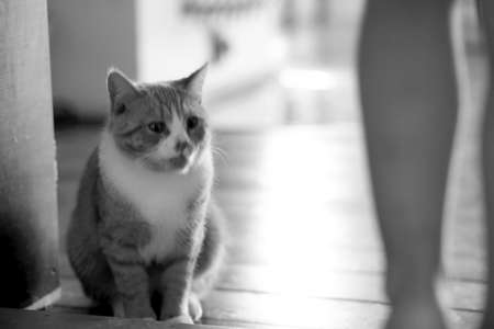 Beautiful cat sitting on the wooden floor and looking at the camera