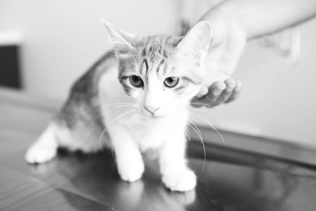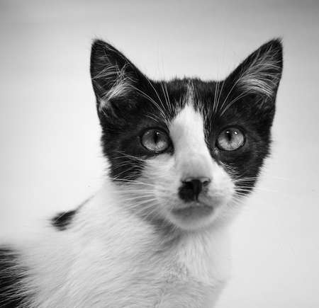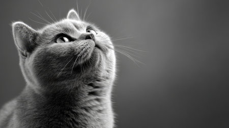 A beautiful grey cat captured in stunning black and white, gazing upward with a curious expression. The image showcases the cat's delicate features and soft fur, evoking a sense of wonder and tranquility. Perfect for animal lovers and pet enthusiasts.