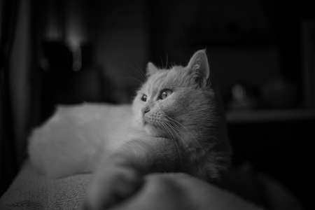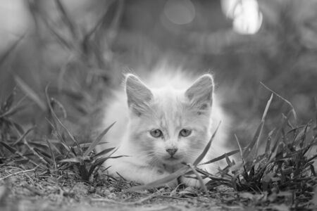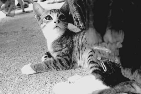 Happy kitten enjoys lying on the carpet. Lovely domestic animals. BW photo.