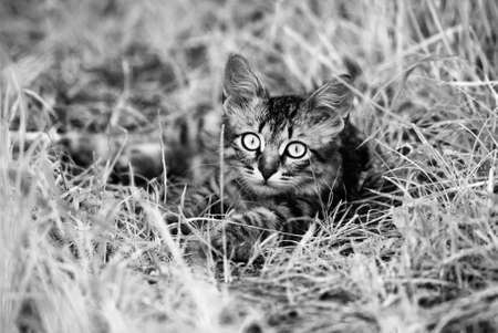 A beautiful striped playing and hunting kitten of unknown breed in the grass in the open air.