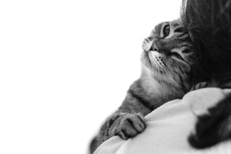 Drowsy sleeping cute cat on a shoulder. Black and white