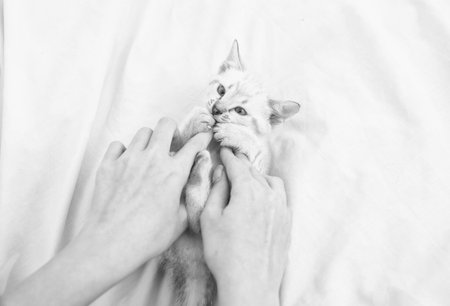 happy lovely cat. Cute kitten in the hands of woman. pet therapy. white fluffy kitten laying on bed. woman take care of her little kitten. trust and support. friendship between human and pet