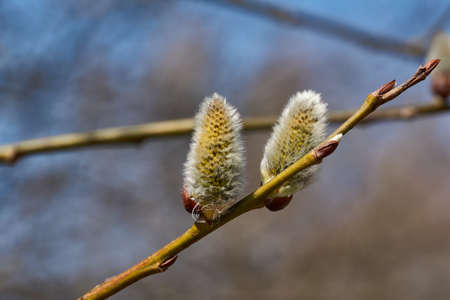 Branches of flowering willow in early spring. Willow flowers with yellow stamens against a blue sky close-up.