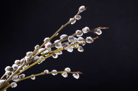 Several pussy willow twig on a black background with copy space or empty text place. Easter greeting card. Religious spring layout. postcard. natural mockup design. springtime. Wartime.