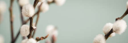Catkins on branch. First Signs of Spring. Beautiful fluffy willow buds close up, blossom pussy willow branch, natural background, selective focus. banner