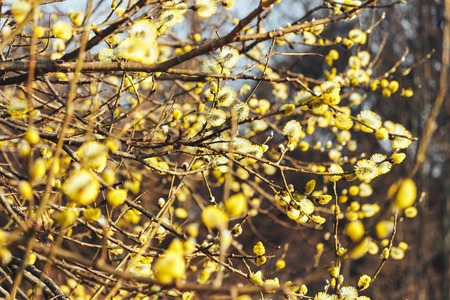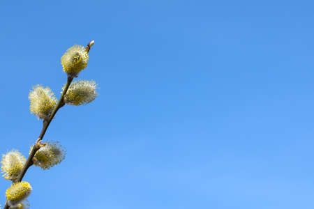 Blooming branches of a yellow willow against a blue spring sky on a sunny day. Palm Sunday. Space for text