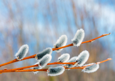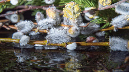 Nature awakes in spring. Blooming willow twigs and furry willow-catkins, so called seals or cats. Palm Sunday. Holly willow, Salix caprea