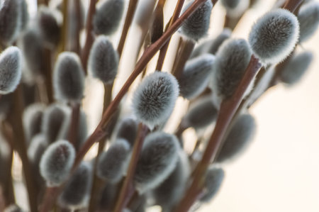 Pussy willow fluffy tiny spring opened buds with branches on light background macro