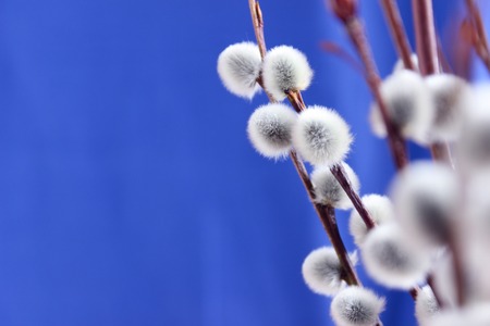 Willow branches with catkin on blurred blue background. Soft bokeh focus.