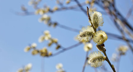 Beautiful pussy willow flowers branches on blue sky background. Soft spring frame with shallow depth of field and bokeh backdrop.