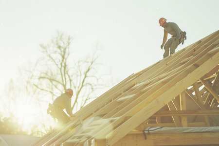 Roofer working on a residential roof at sunset, showcasing skilled craftsmanship and the beauty of construction. Generative AI