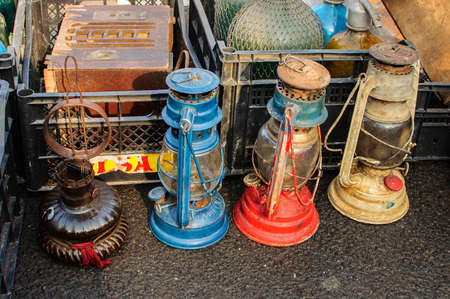 very old, used vintage metal gas light, as an ancient rusty object on the dusty platform
