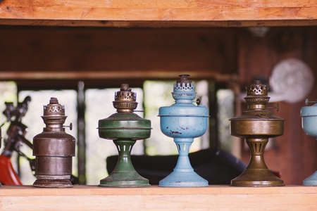 Vintage lights lie on the old wooden table. Broken light bulb with holder and wire. Kerosene lamp, kerosene lantern bat. The photo was taken using a light brush effect it.