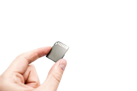 Man hand holds Memory card - Flash card against white background.Concept photo , multimedia, photography,communication, gaming, lifestyle. copy space.