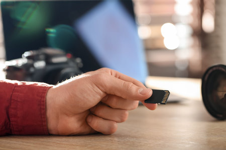 Man inserting SD memory card into laptop at wooden table indoors, closeup