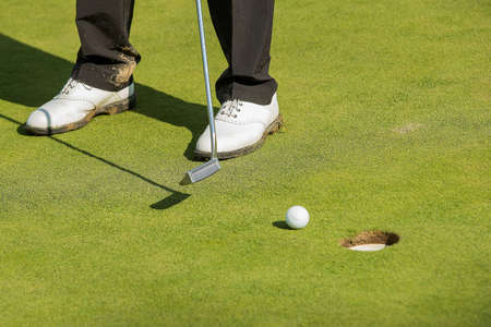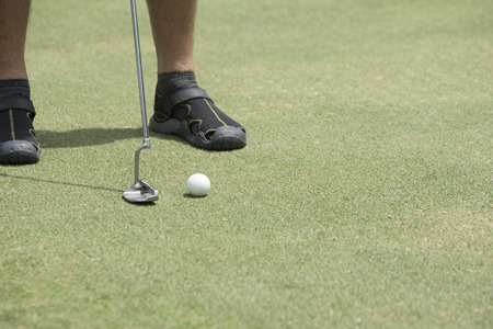 Golfer puts on green for birdie on vacation. Golfer feet on green hitting hole