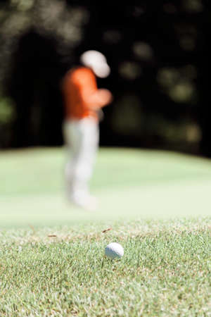 Man playing golf on green course, ball in focus