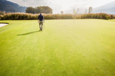 Golfer putting ball on the green golf, lens flare on sun set evening time. Blurred golfer playing golf in beautiful golf course.