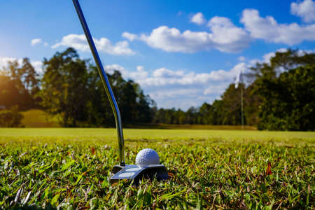 Golf clubs and ball on a green lawn in a beautiful golf course with morning sunshine. golf ball on green grass ready to hit on golf course background.