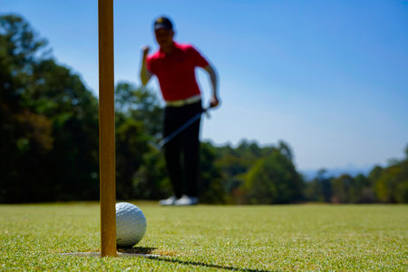 Golfer plays golf on golf course. Man playing golf on golf course ball in hole