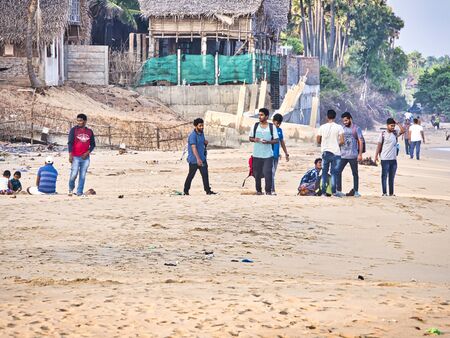 PUDUCHERRY, INDIA - DECEMBER Circa, 2018. Unidentified students group at beach talking before going to have a bath in sea
