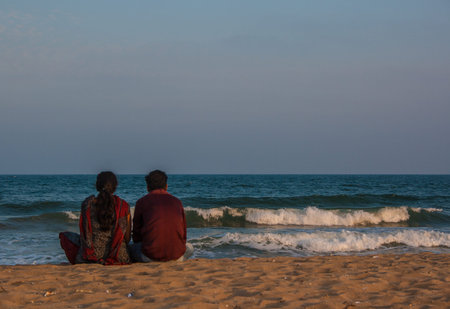 A couple relaxes on the beach in Mamallapuram, Tamil Nadu, India.