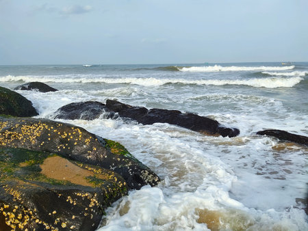 Aerial View of Waves and Azure beach with rocks. Kerala, India.